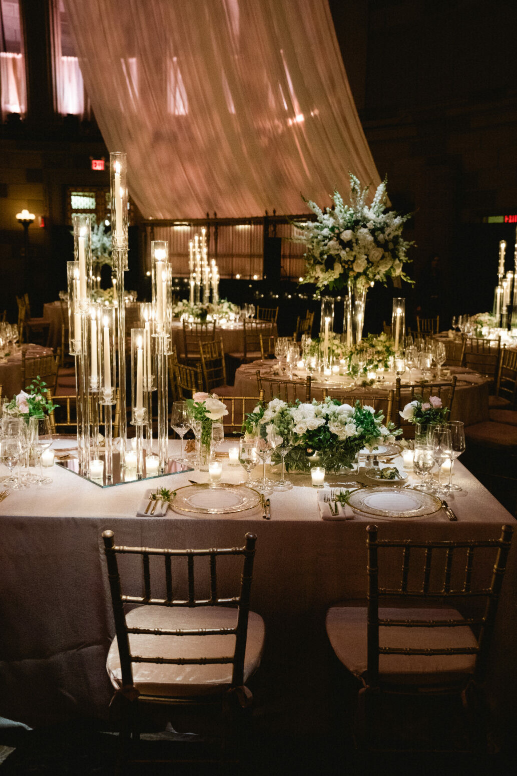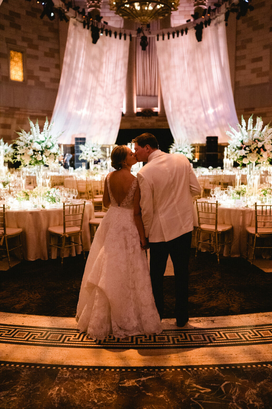 The night continued on, to the elegant Gotham Hall, where guests experienced a beautiful ballroom with an ornate stained-glass skylight. Under the soft draping, enchanting floral arrangements and lighting created an experience unlike any other.